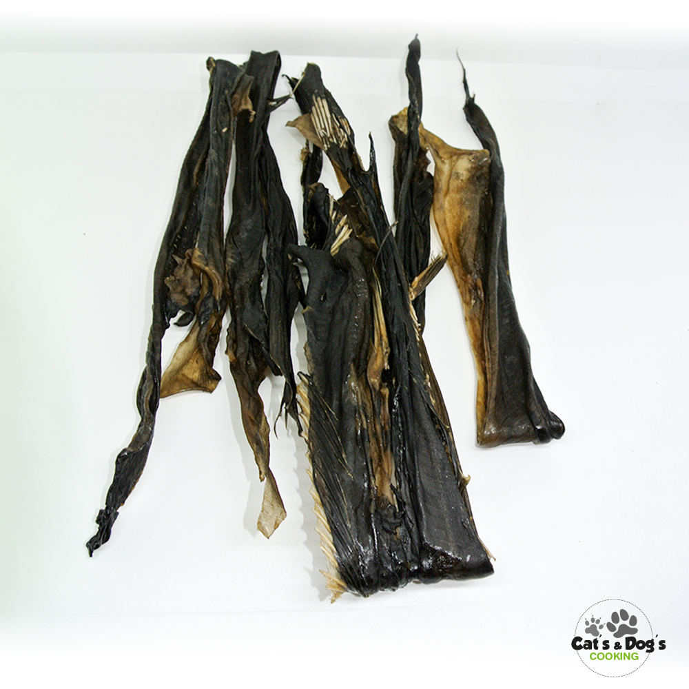 La fish and chicks box contient : 200g de pièce de saumon, 250gr de peau de poisson chat, 100g de twist de peau de cabillaud, 4 lamelles de poulet, 6 pattes de poulet, 250g de filet de poulet