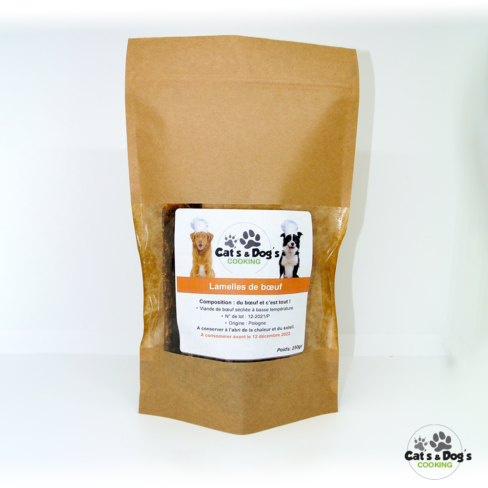Friandises 100% naturelle, séchées à basse température. Snack délicieux pour tous! 100% bœuf. Ces lamelles de viande sont de texture assez souple et peuvent être coupées en petits morceaux pour donner en récompense à votre chien, lors de ses séances d’éducation. Elles peuvent aussi être données entières comme encas. Dans tous les cas, elles seront appréciées par vos poilus.