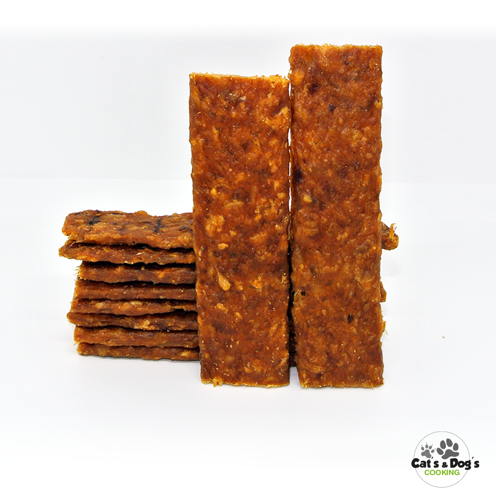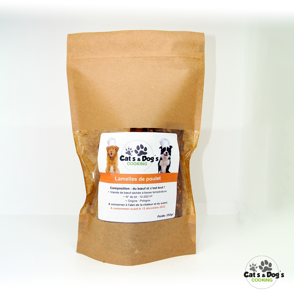 Friandises 100% naturelle, séchées à basse température. Snack délicieux pour tous! 100% poulet. Ces lamelles de viande sont de texture assez souple et peuvent être coupées en petits morceaux pour donner en récompense à votre chien, lors de ses séances d’éducation. Elles peuvent aussi être données entières comme encas. Dans tous les cas, elles seront appréciées par vos poilus.